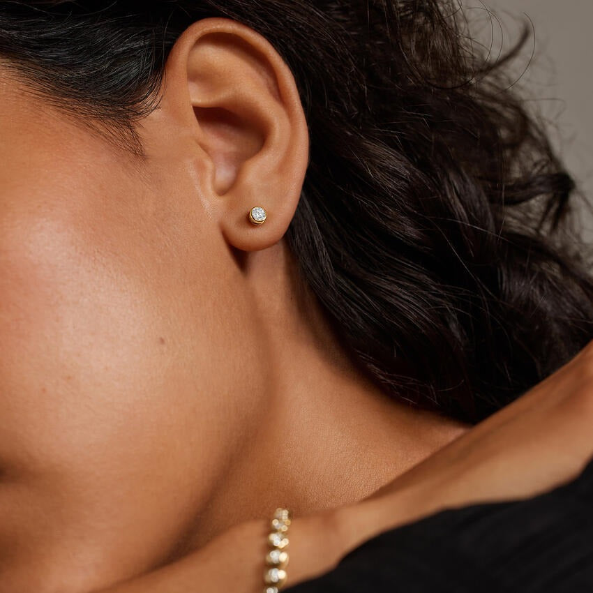A quiet circle of light — modern, refined, and effortlessly radiant. The Round Bezel Studs frame each lab-grown diamond in a smooth, luminous bezel, creating a glow that feels soft yet striking. The clean silhouette enhances the stone’s natural brilliance, allowing it to shimmer with calm confidence and understated elegance.