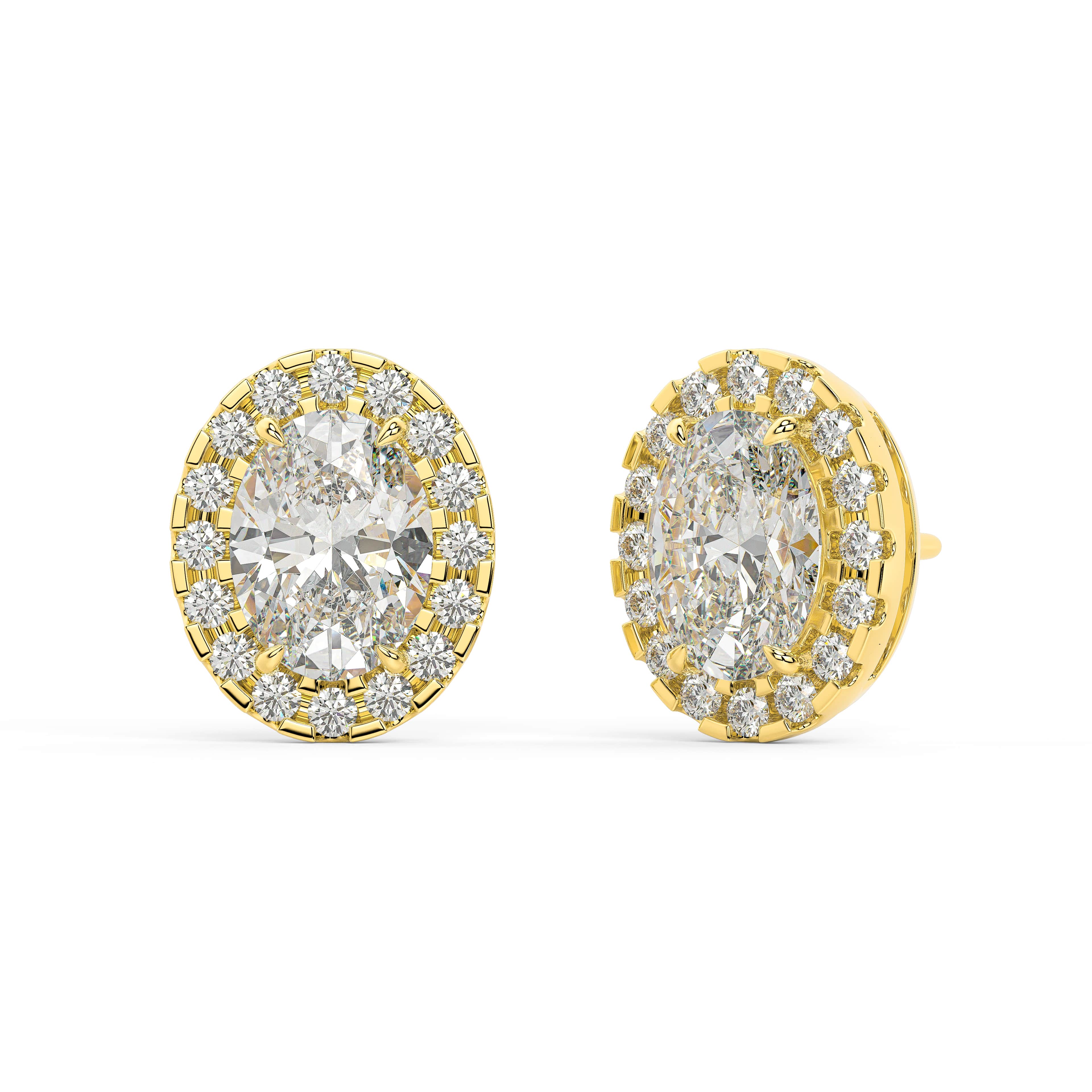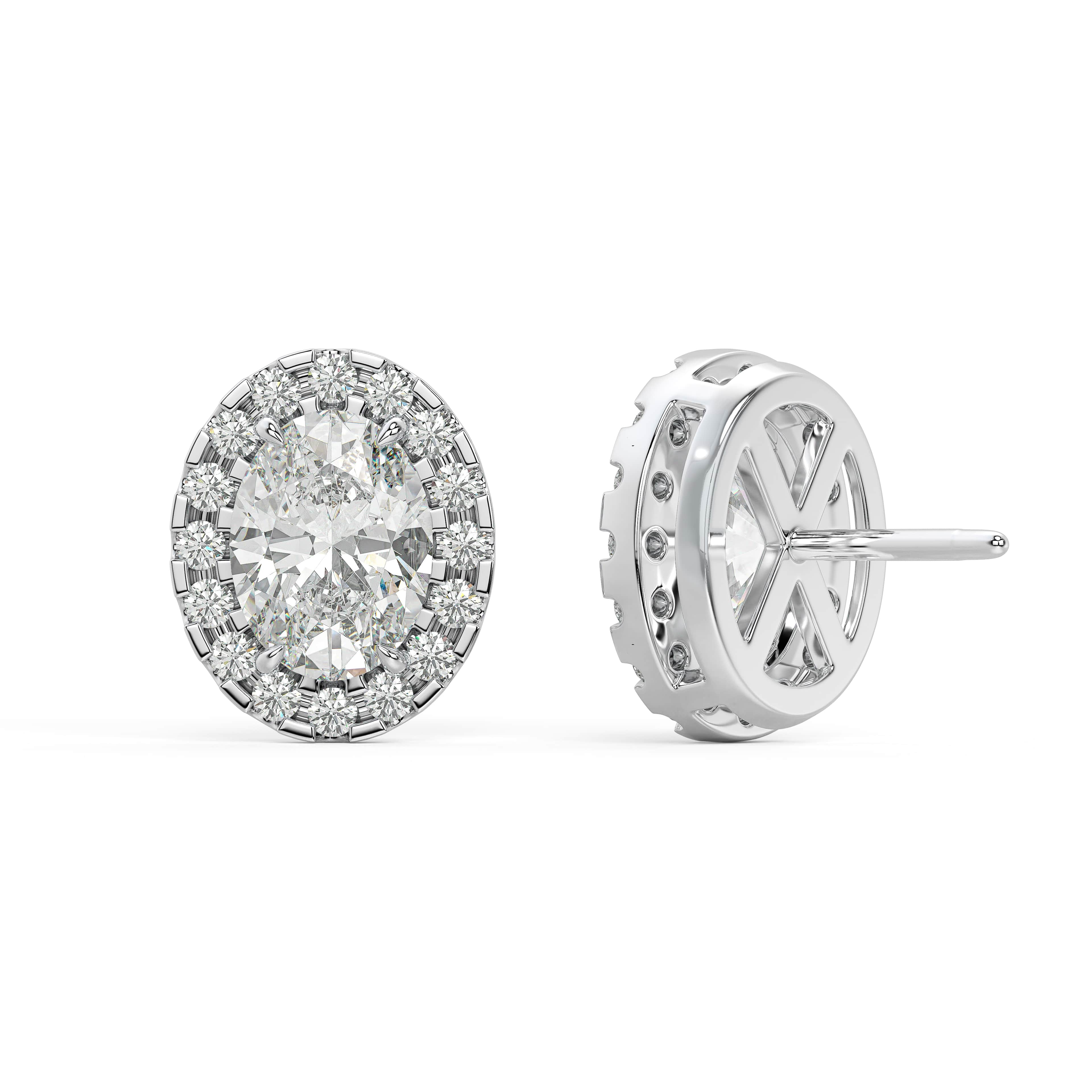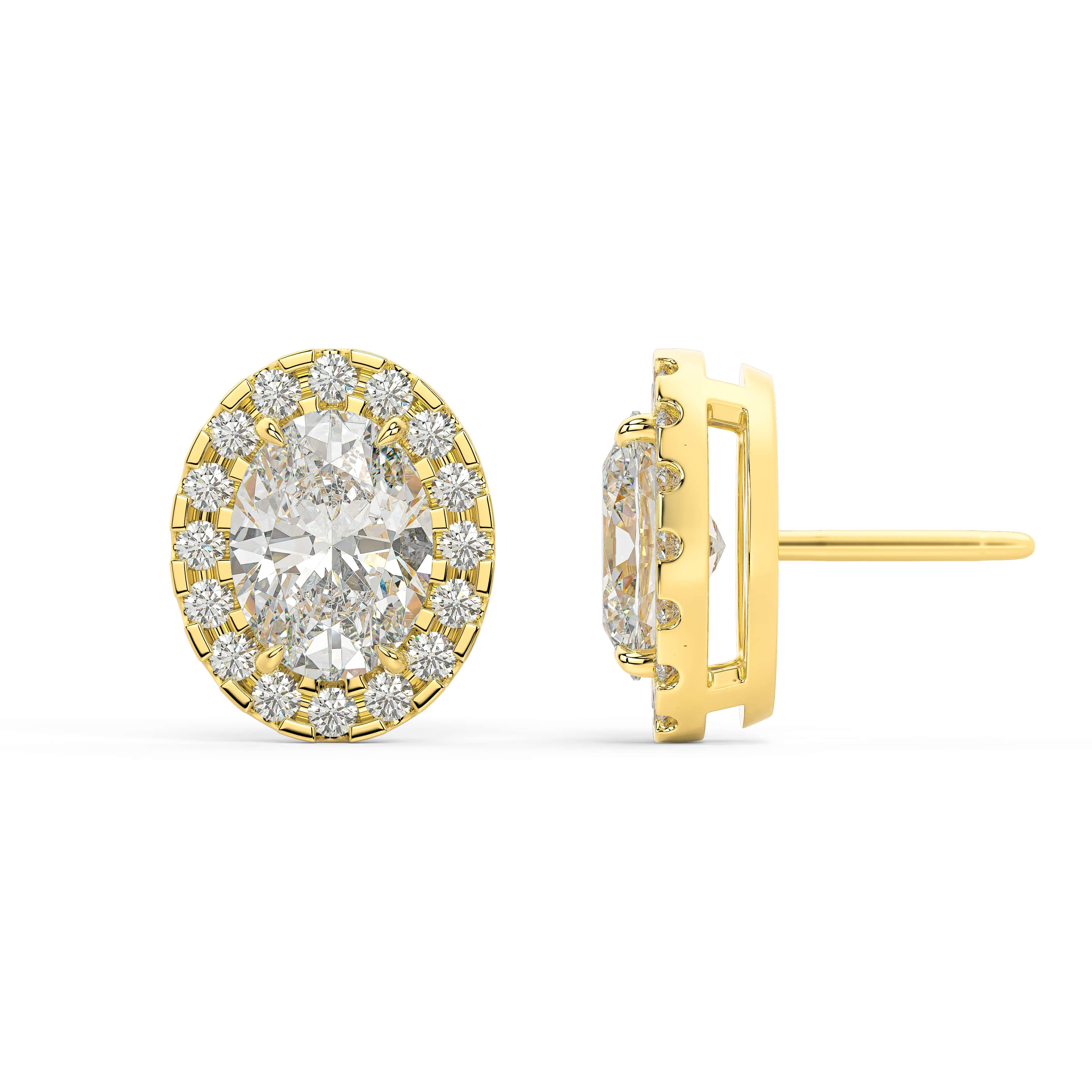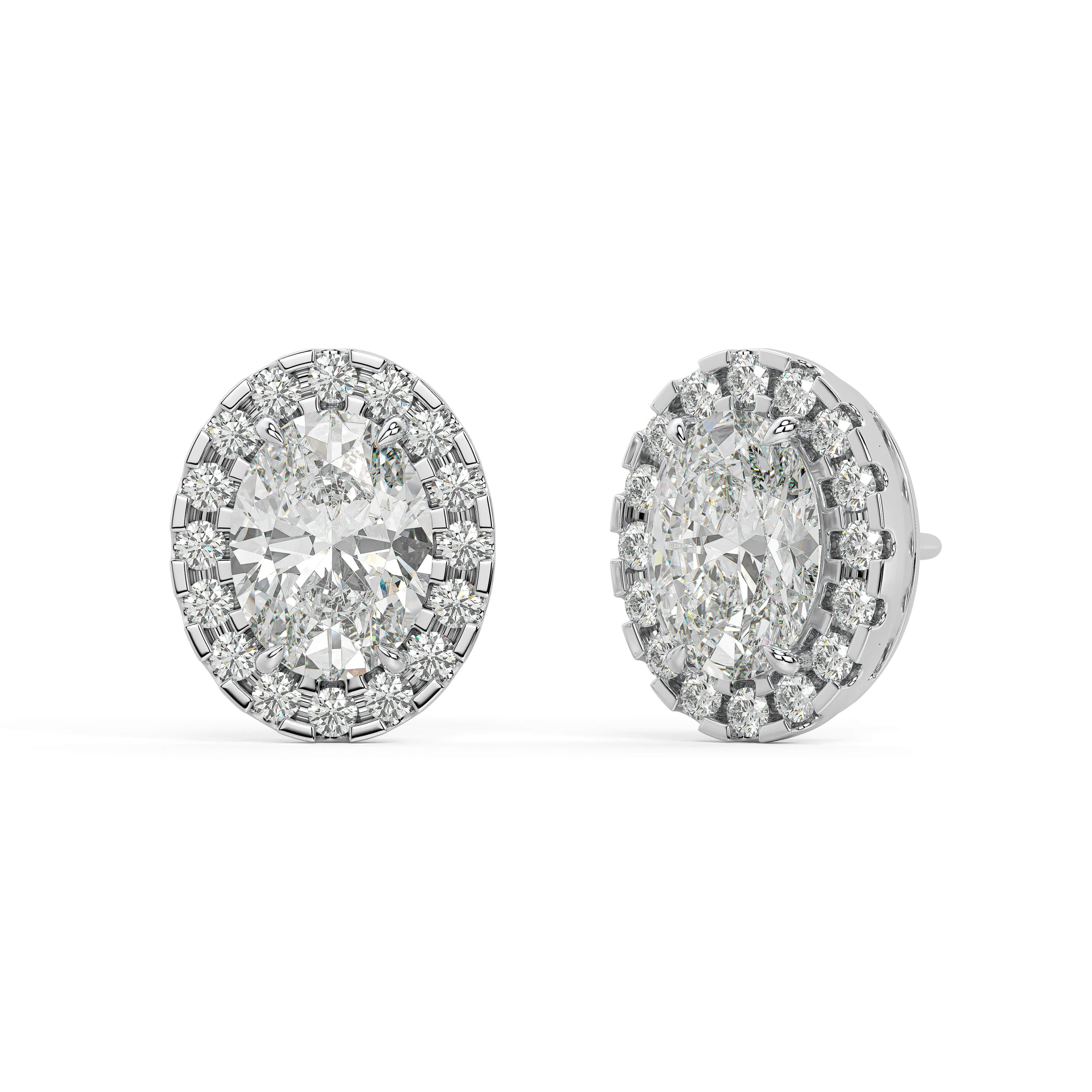 An oval of brilliance — graceful, radiant, and beautifully balanced. The Oval Halo Studs celebrate the elongated elegance of the oval cut, framed by a luminous halo that enhances its natural symmetry. At the center, soft curves and brilliant facets capture light fluidly, while the surrounding halo creates a seamless outline of sparkle.