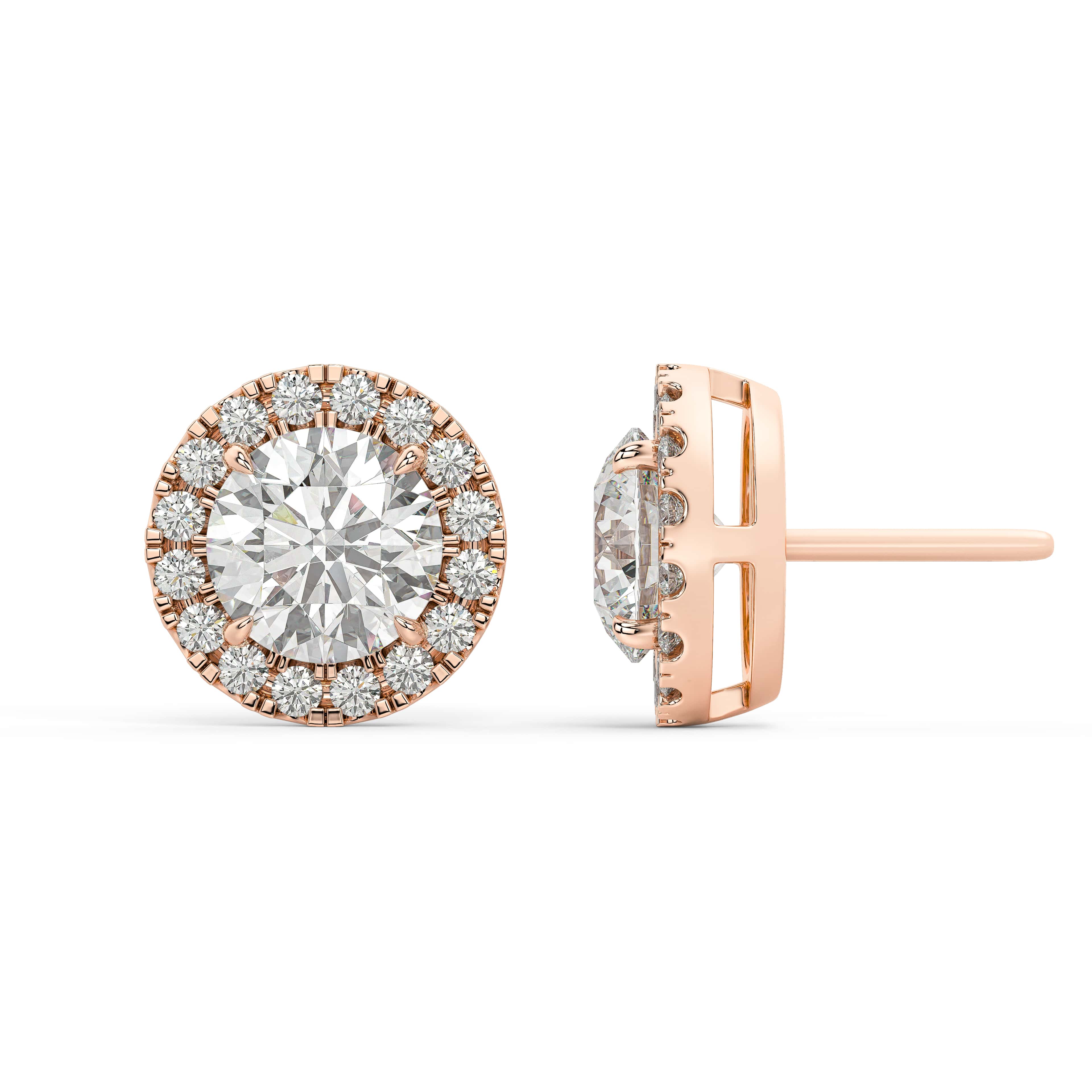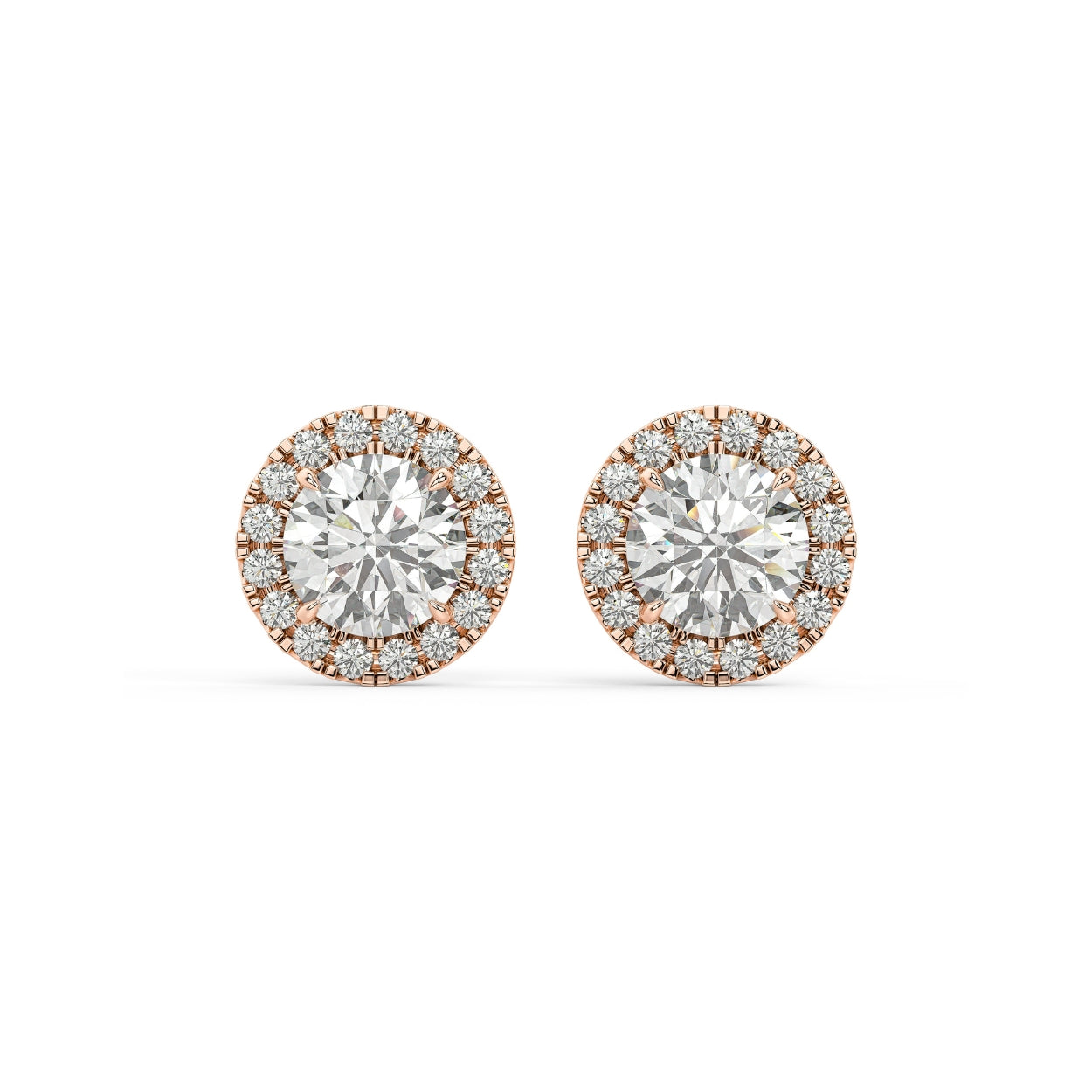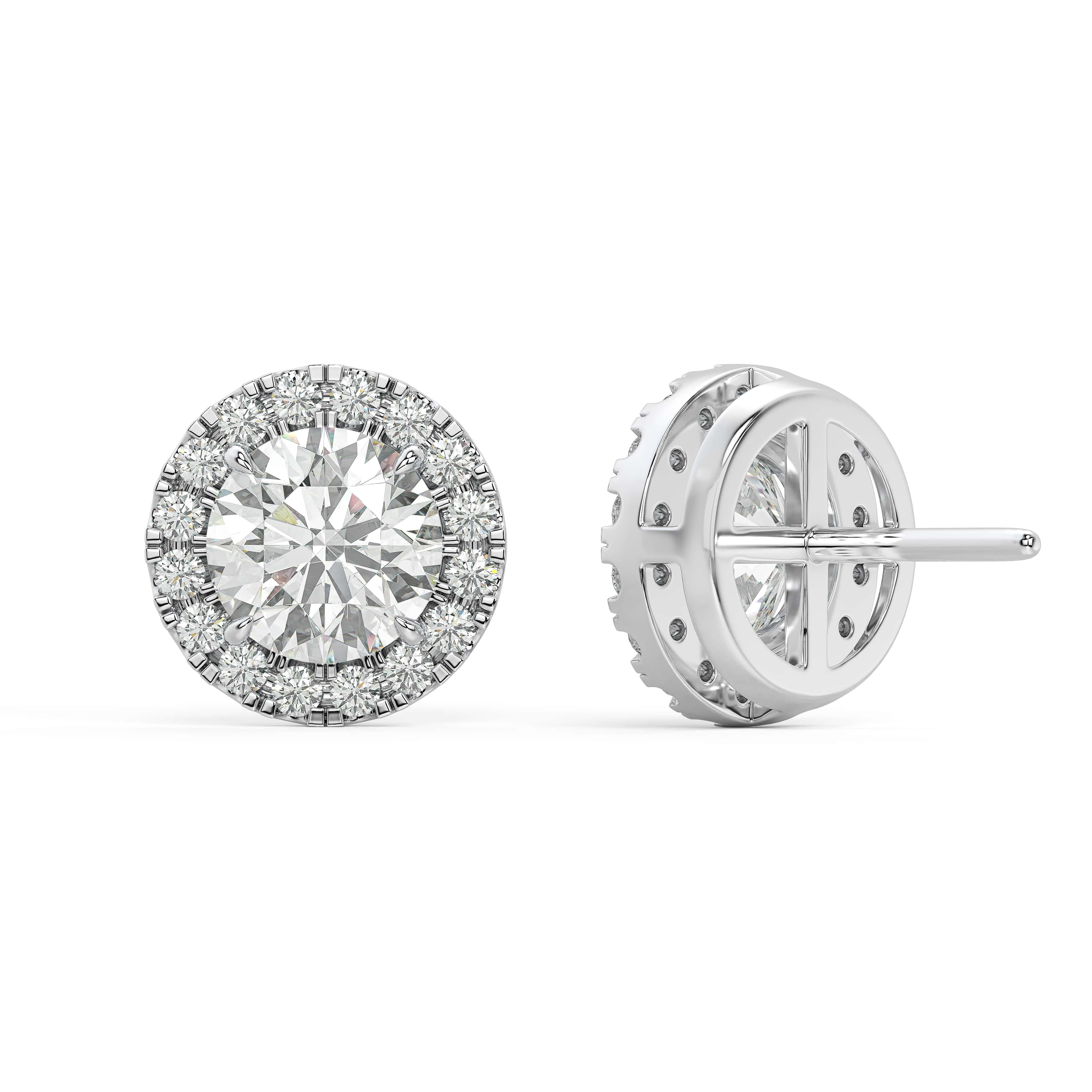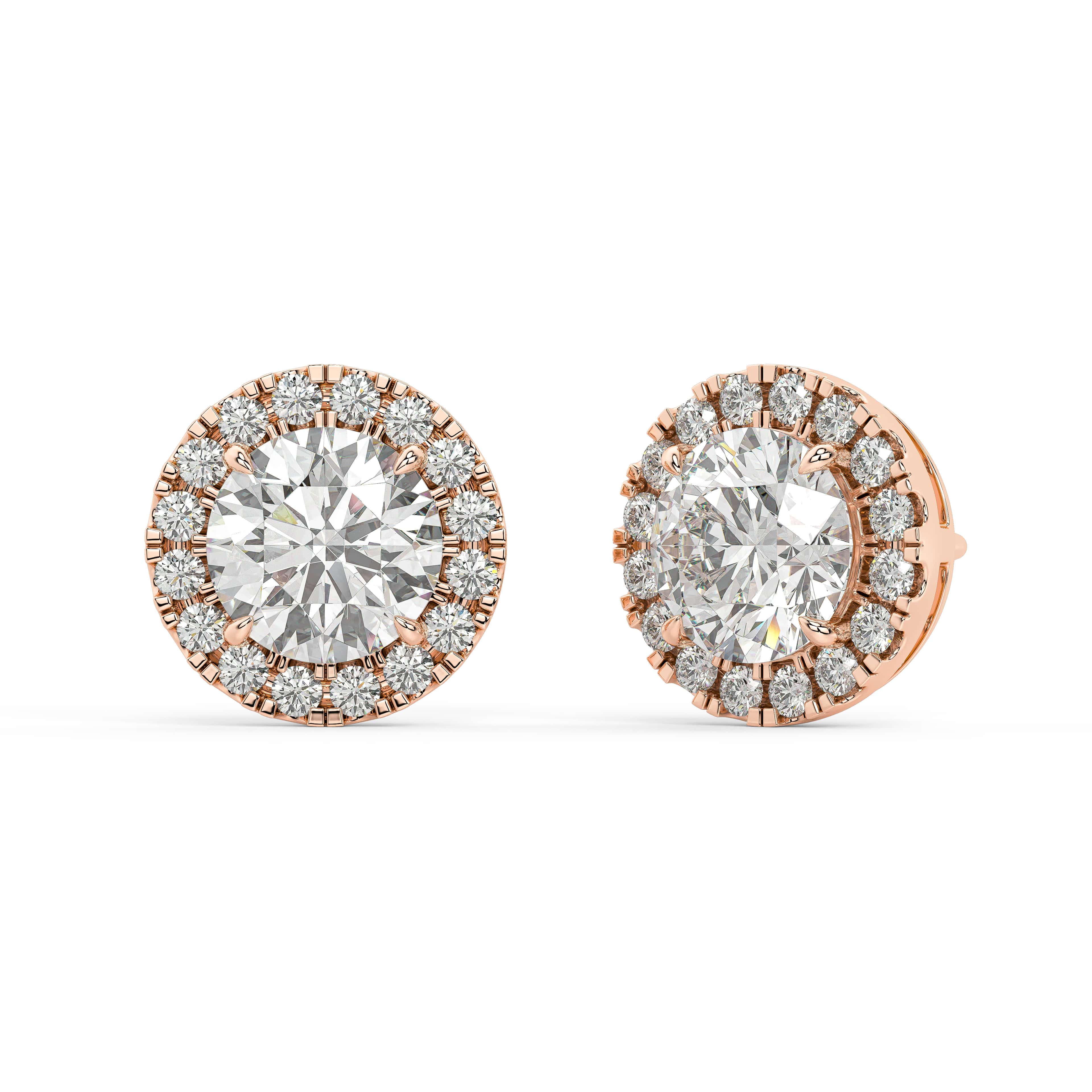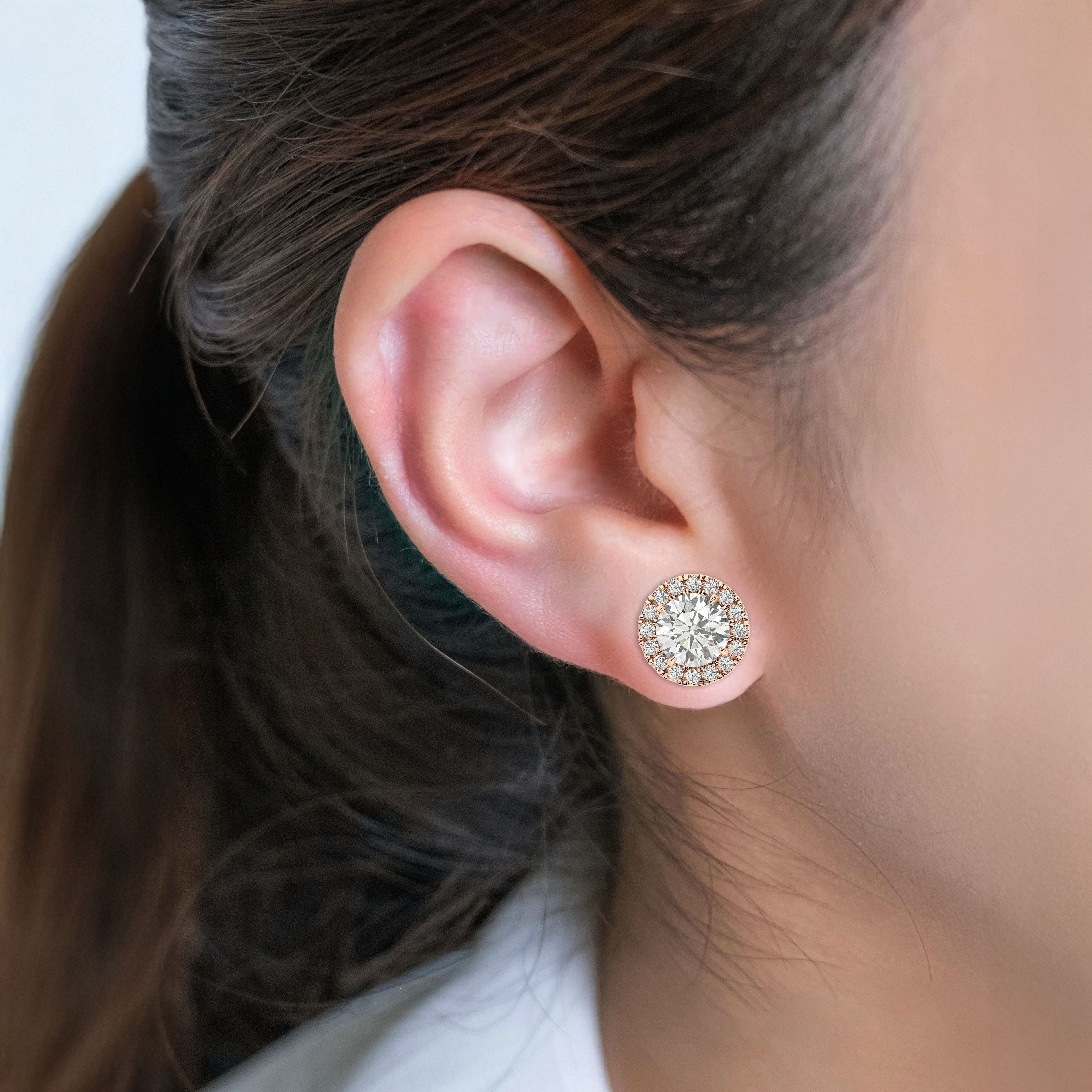 Set in a classic four-prong design, the center stone remains elevated and defined, embraced by a delicate halo that adds dimension without overwhelming the silhouette. The result is a balanced composition — bold yet graceful, luminous yet elegant. Whether worn as an everyday signature or reserved for moments that matter, these studs embody brilliance, harmony, and softly spoken luxury.