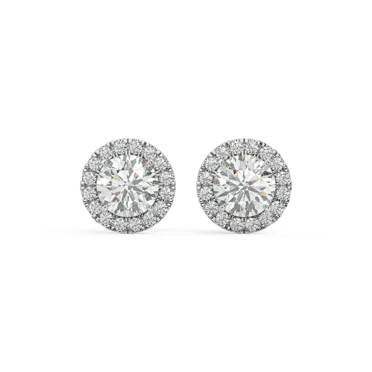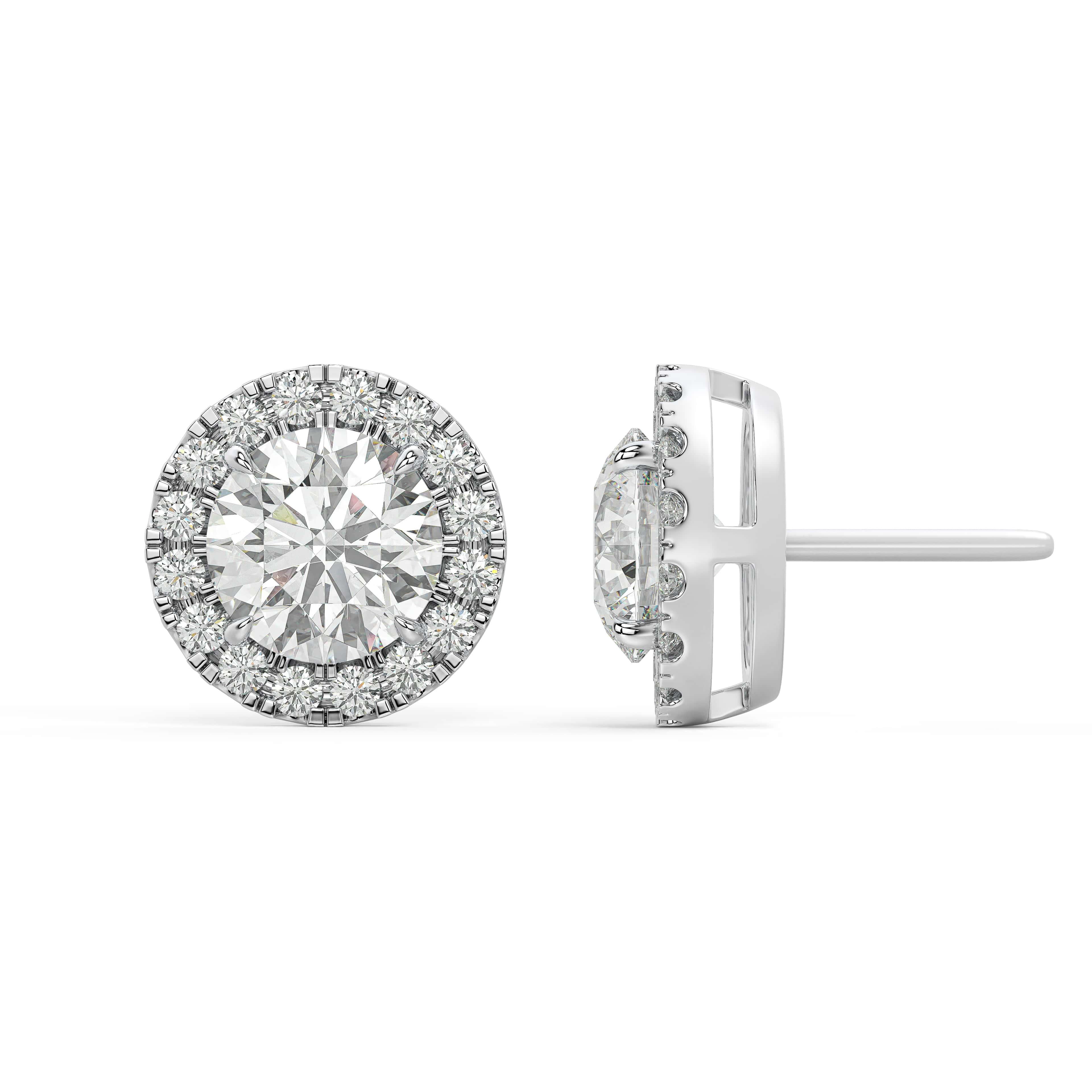 A circle of light — radiant, refined, and beautifully expressive. The Round Halo Studs celebrate the timeless brilliance of the round cut, surrounded by a luminous frame of diamonds that amplifies its fire. At the center, the round diamond gathers light with perfect symmetry, while the halo enhances its glow in a seamless cascade of sparkle.