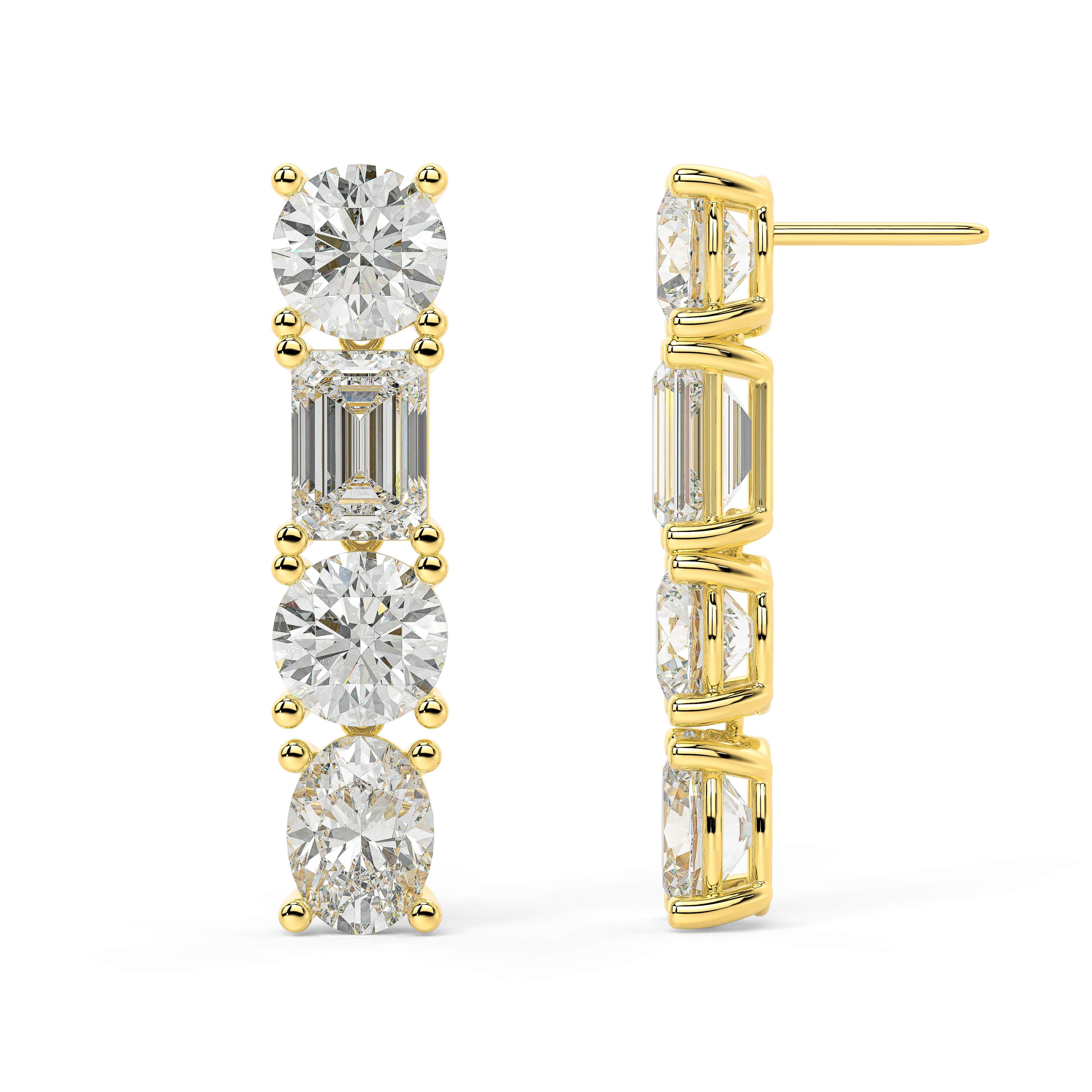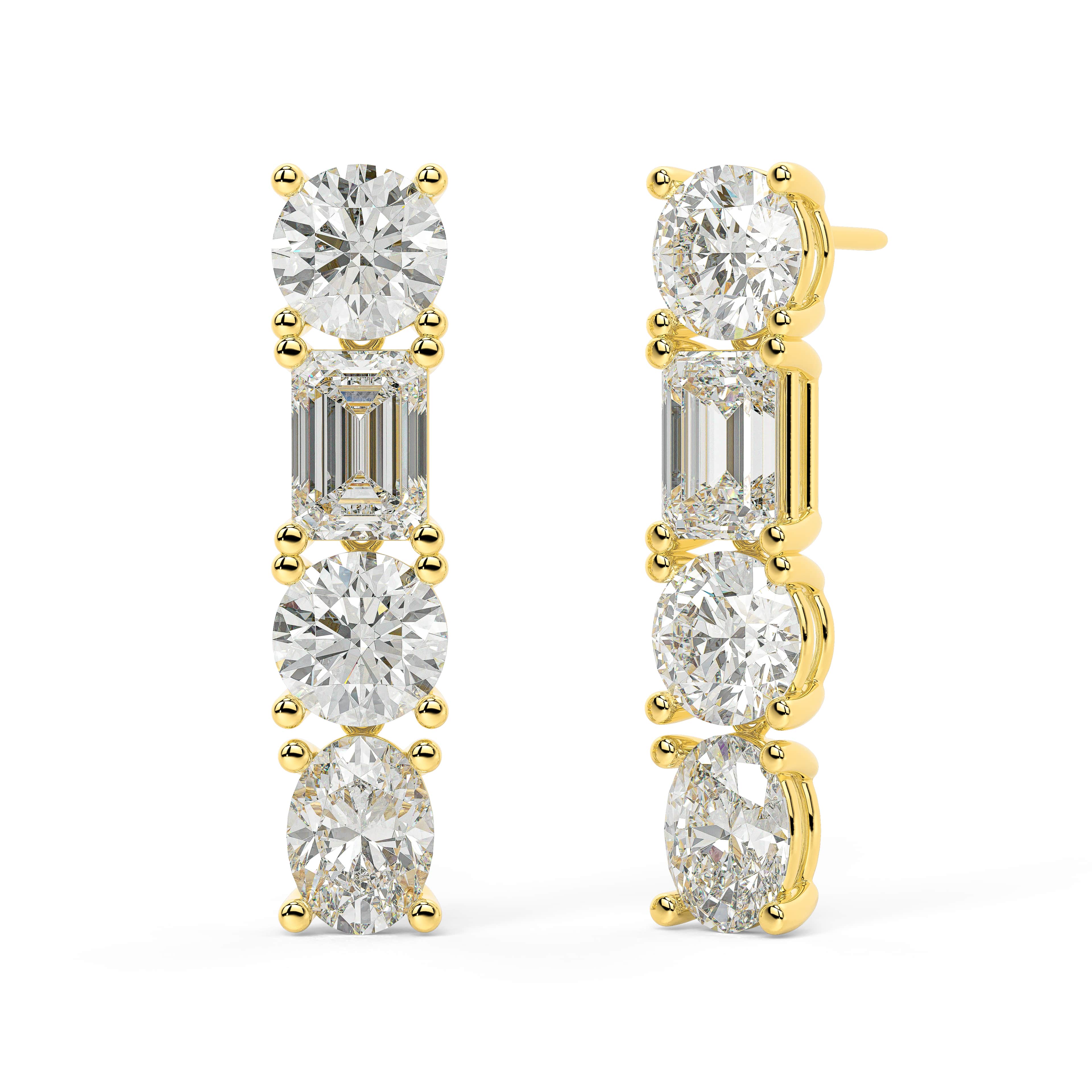 The Thalora Drops are a modern ode to radiant individuality. This striking vertical composition features an alternating sequence of fancy yellow and brilliant white lab grown diamonds, where the warmth of the sun meets the purity of starlight. By blending architectural emerald cuts with the soft curves of round and pear shaped stones, these earrings create a rhythmic silhouette that elongates the neck and illuminates the face with effortless sophistication.